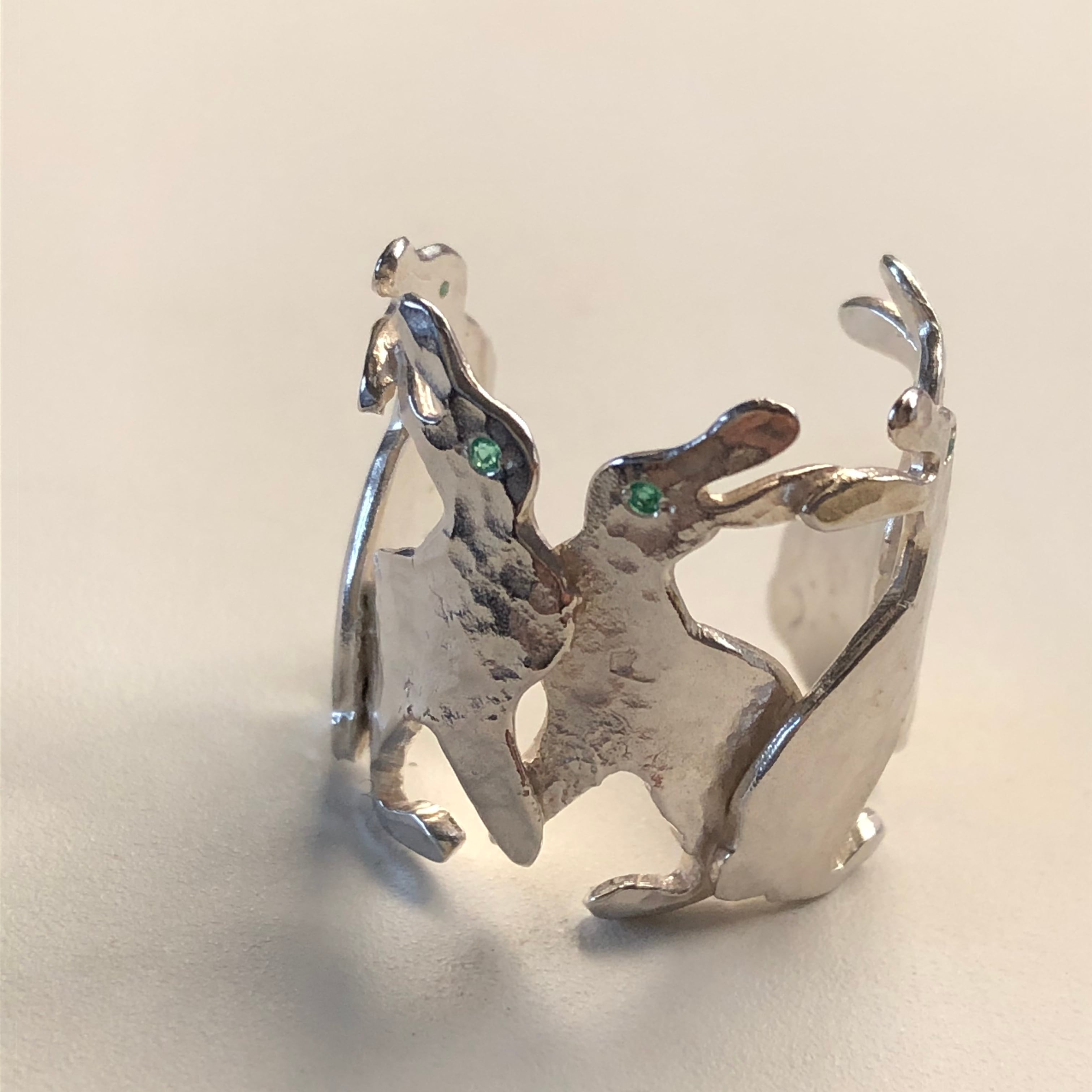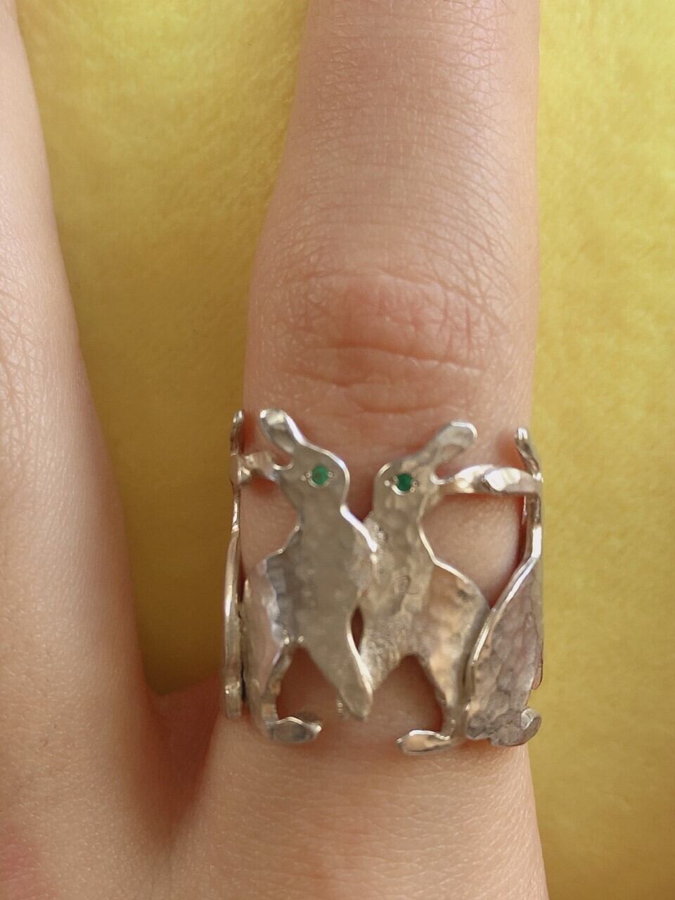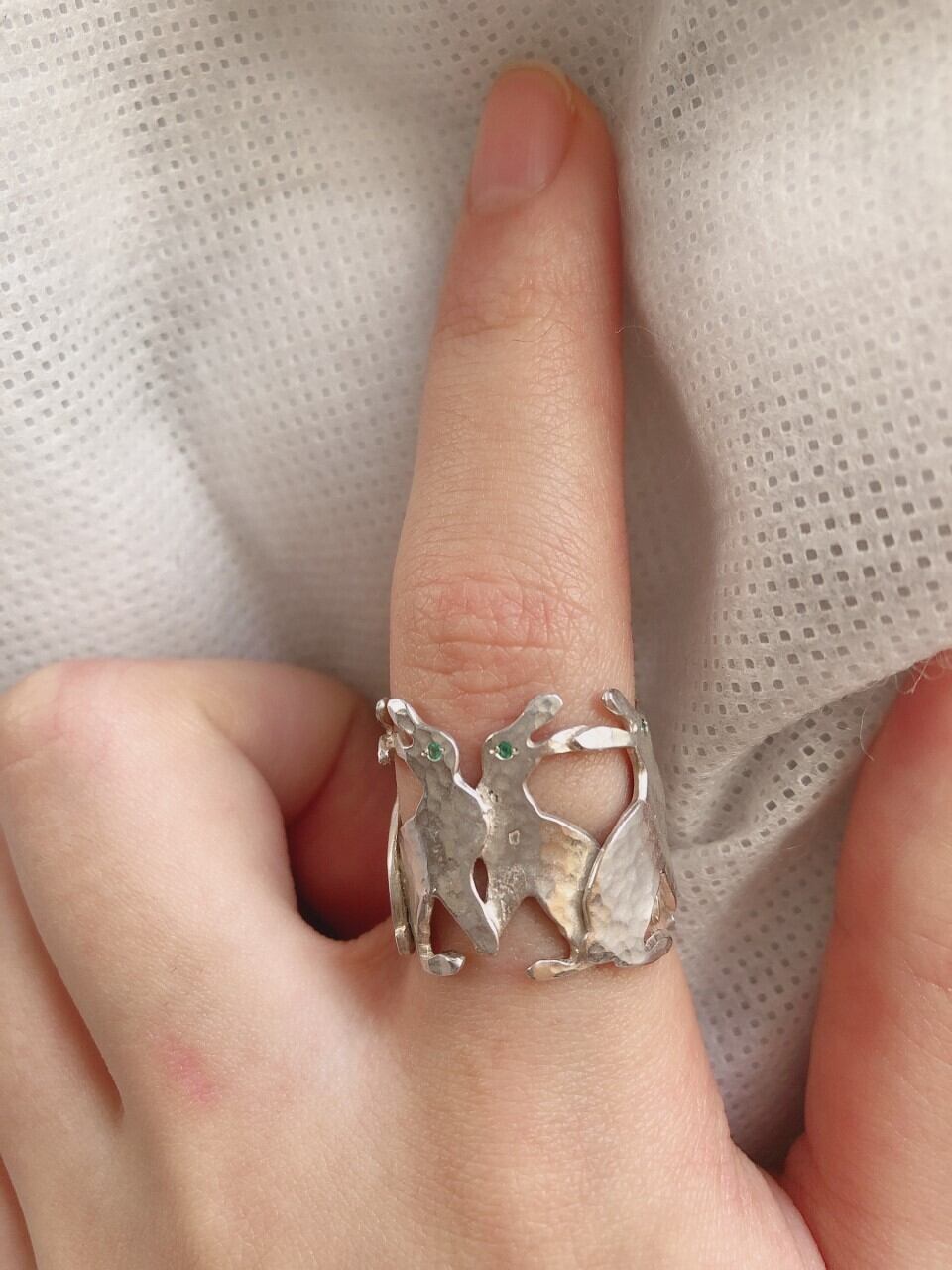 うさぎ5匹リングにグリーンのエメラルドの瞳がくるぐります!
